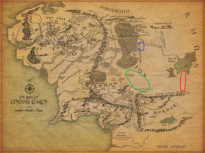 Тут мне показалось интересным уточнение про внутренне море(видимо, это море Рун) и Пепельными горами, которые Эред Литуи. То есть это как-бы нижняя половина примыкающего к Андуину пространства равнины южнее Леса. А в верхней, надо так понимать, было население и до Северян(ну в истории про Ирисную низину оно там и было). Иначе не нужно было бы уточнять. И да, получается вся равнина южнее Леса была заселена. И, раз Гондор владел землями до моря Рун, то это были земли его. А этим северянам там разрешили жить. Ну, Гондор так считал.