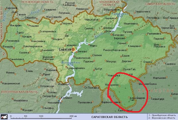 и обведенный такой хорошо опознаваемый выступ-рукоятка, вдающийся в Казахстан - Новоузенский и Алгайский районы. Так вот этот выступ - 7 тыс. кв. км. А если Тульскими областями мерять, то больше четверти будет. Вы представляете, такую территорию вырубить вручную! Сколько лет потребовалось бы ее рубить!